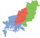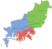 부산광역시의 세 가지 방안의 권역 구성을 살펴보면 기상+사회경제 결합 시나리오는 기온이 낮고 강수가 적은 저지대인 서부, 인구와 산업이 밀집한 남해안 중부, 그리고 인구밀도는 낮지만 기온이 높고 산지 내륙을 포함하는 동부로 분류한다(Fig. 6a). 위험기상 기반 방안은 폭염 발생 빈도가 높은 남부 해안이 하나의 권역으로 묶이고 호우특보기준 도달 빈도에 따라 동부와 서부로 분류한다(Fig. 6b). 위험기상+사회경제 결합 방안은 인구가 밀집한 중부, 호우 빈도의 영향을 받은 동부와 서부로 분류한다(Fig. 6c).